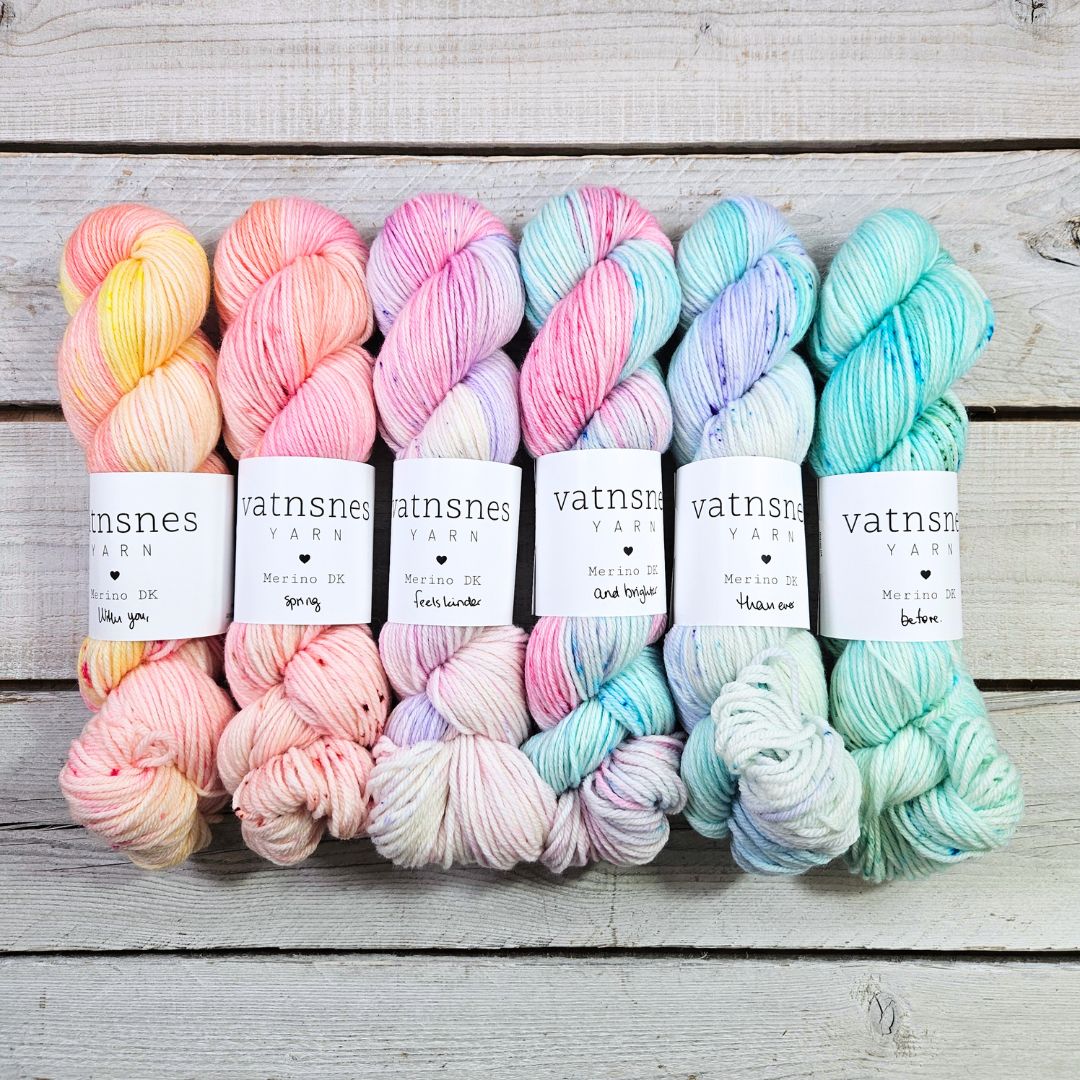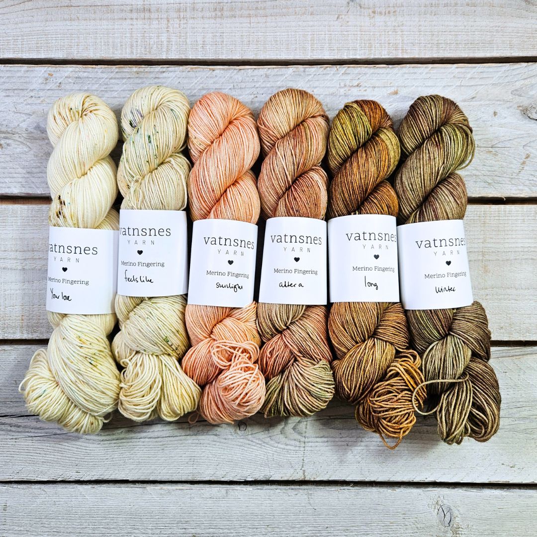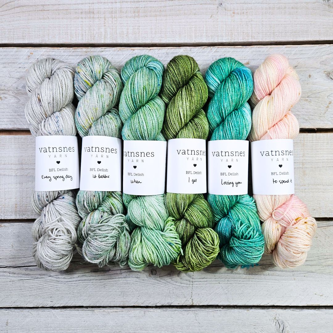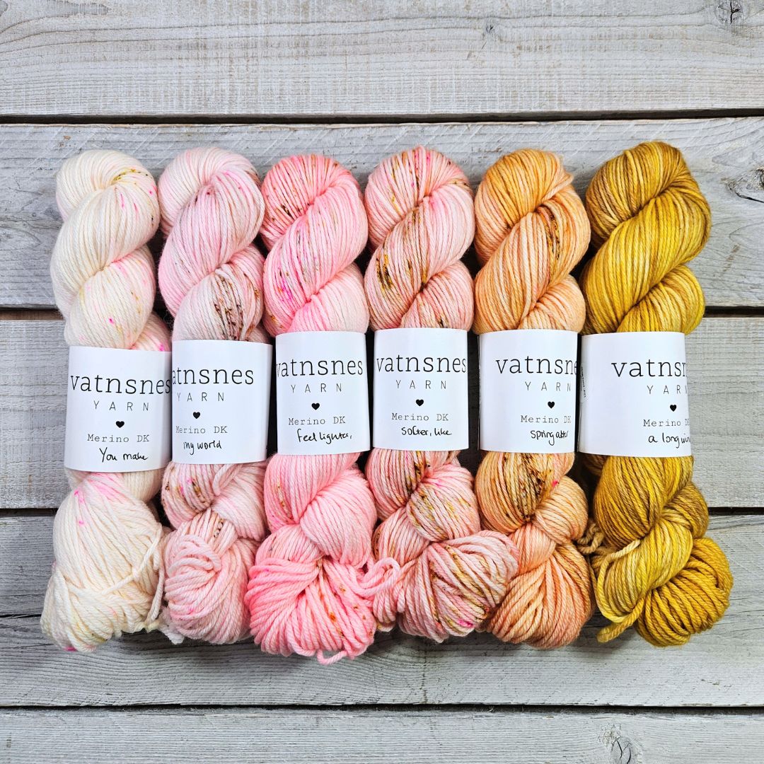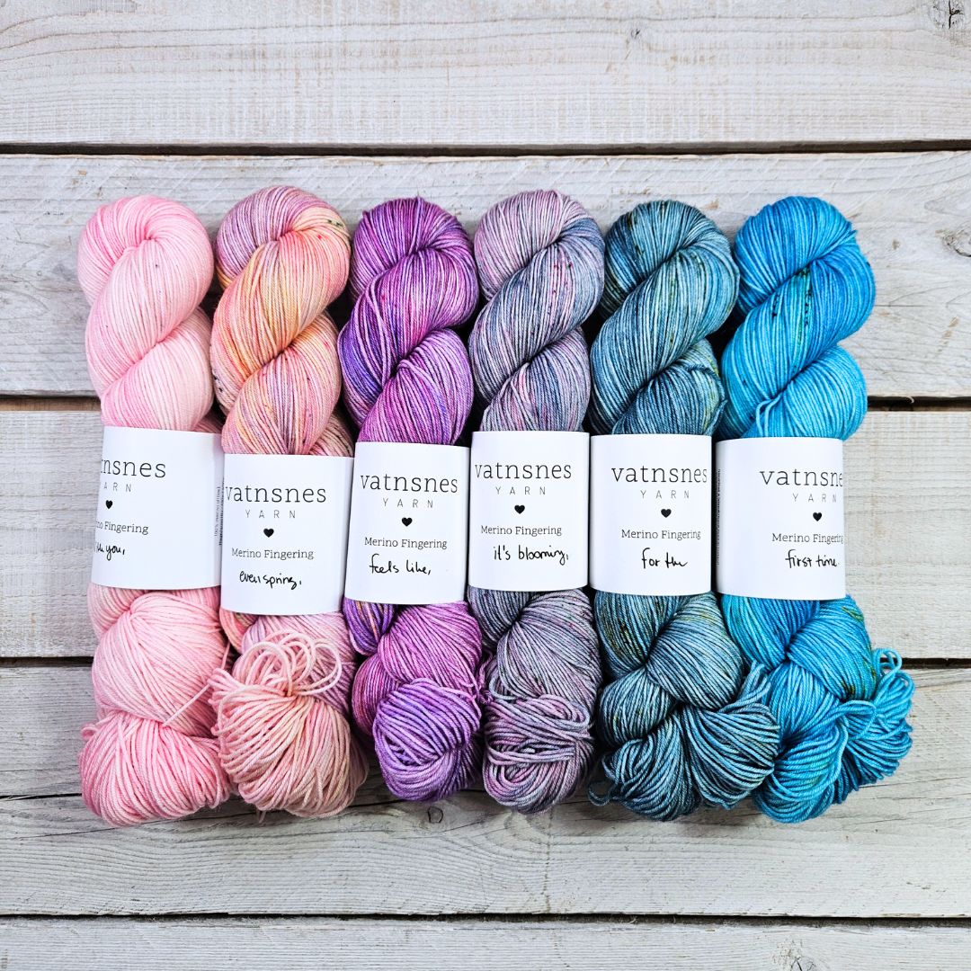 Leikurinn er þannig að ég set saman litaþemu og vel hvaða garn er í boði. Í VOR 2026 klúbbunum voru 6 tegundir af garni í boði og 6 litaþemu.