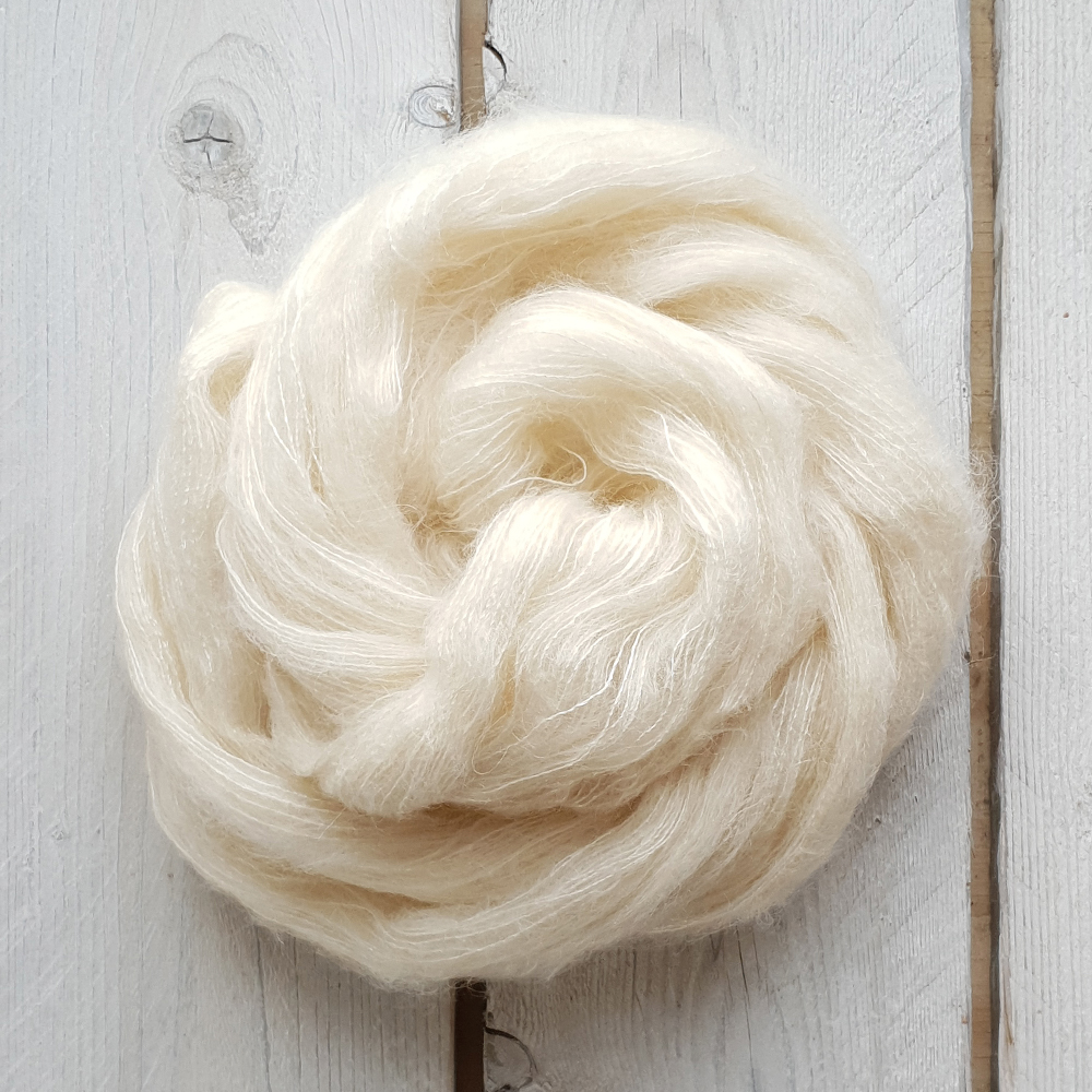 Mohair Lace er mjög ljúft lace/fis band. Það er fíngert, mjúkt, loðið og silkið gefur fallegan gljáa. Frábært með öðru garni og einnig frábært í áferðar kontrast.