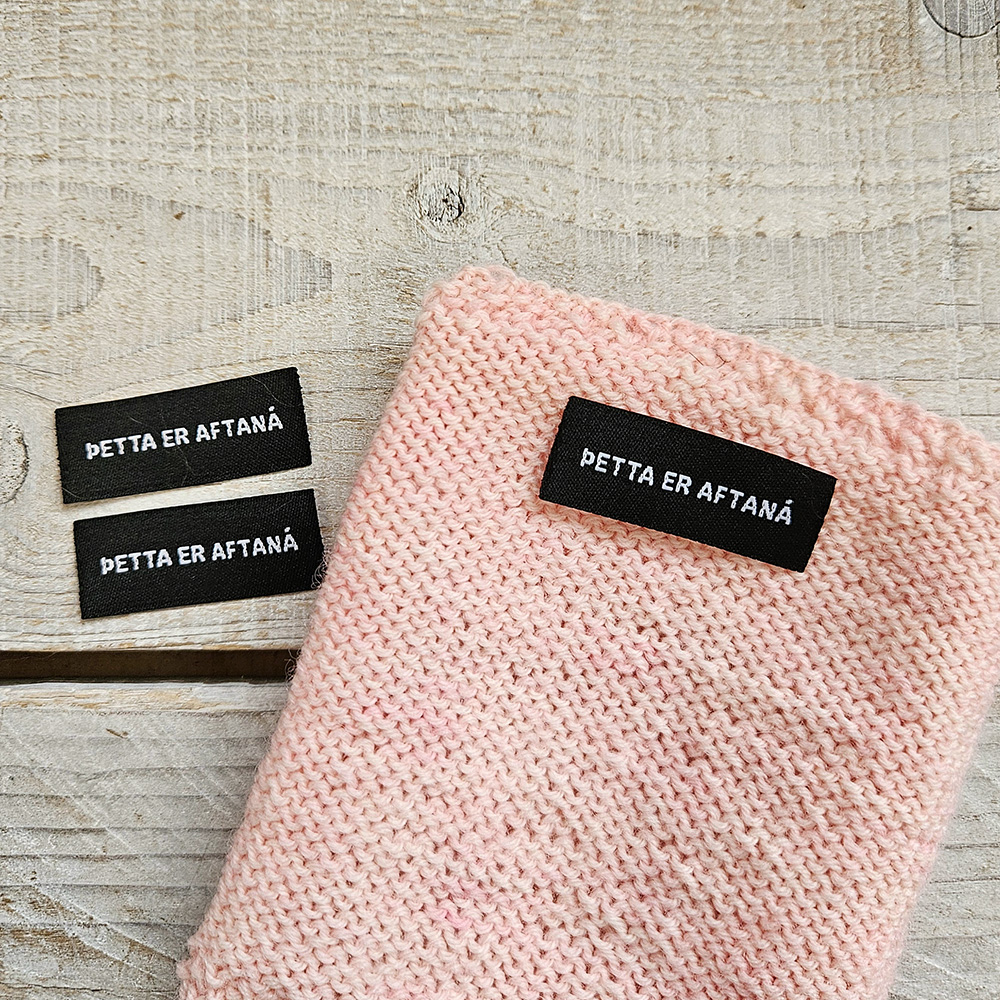 Á þessu fatamerki stendur “þetta er aftaná” en það er ætlað til þess að merkja bakhliðina á t.d peysum og buxum. Merkið er einfaldlega saumað í t.d hálsmál peysu, á röngunni og enginn þarf lengur að efast um hvernig handprjónaða flíkin á að snúa. Merkið er úr bómull og er 1cm á hæð og 3cm á lengd. Það eru 3 merki saman í pakka.