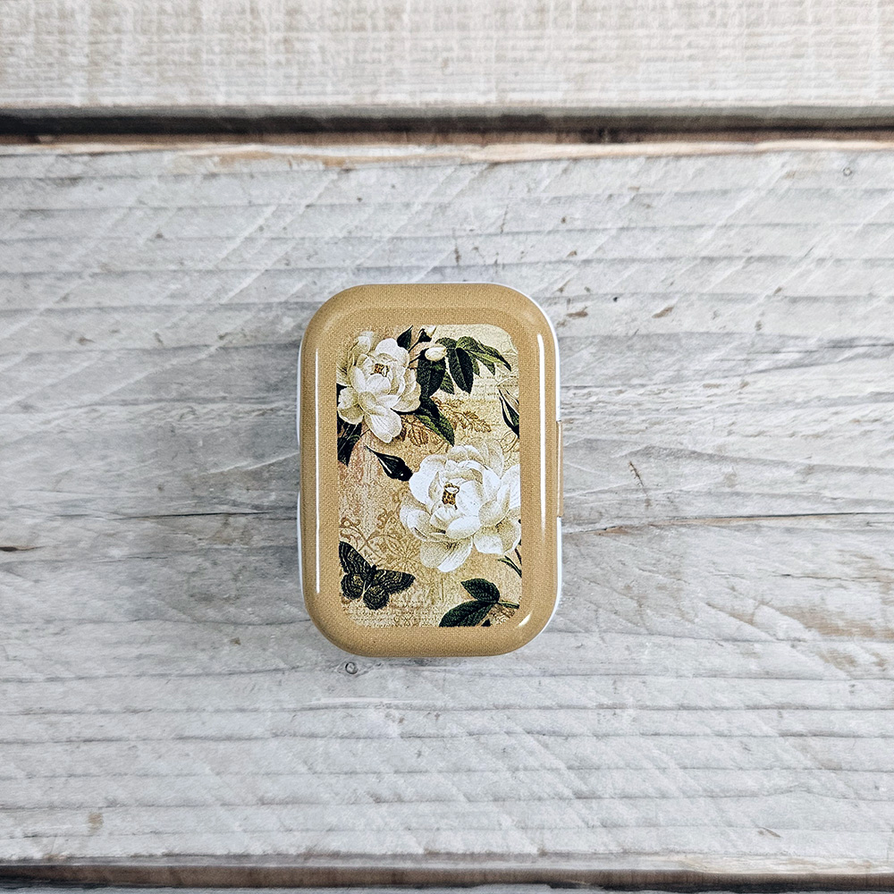 Sæt dós með áföstu loki, sem fullkomið er að geyma prjónamerki og framvindumerki í. Dósin er úr málmi og fallega myndskreytt.