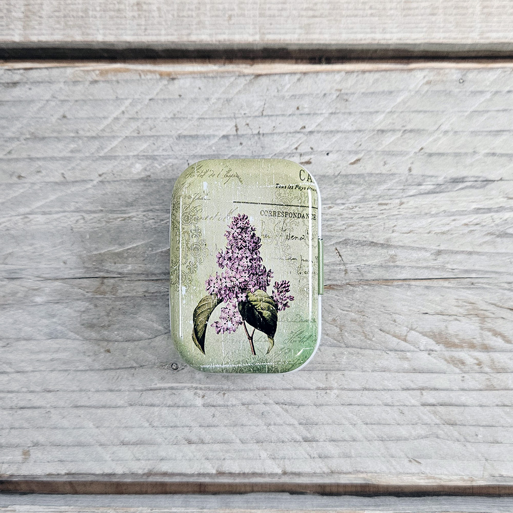 Sæt dós með áföstu loki, sem fullkomið er að geyma prjónamerki og framvindumerki í. Dósin er úr málmi og fallega myndskreytt.