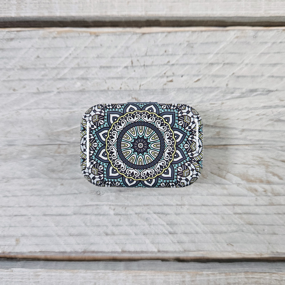 Sæt dós með áföstu loki, sem fullkomið er að geyma prjónamerki og framvindumerki í. Dósin er úr málmi og fallega myndskreytt.