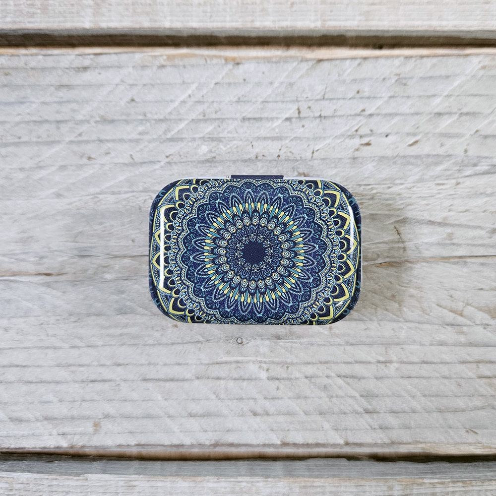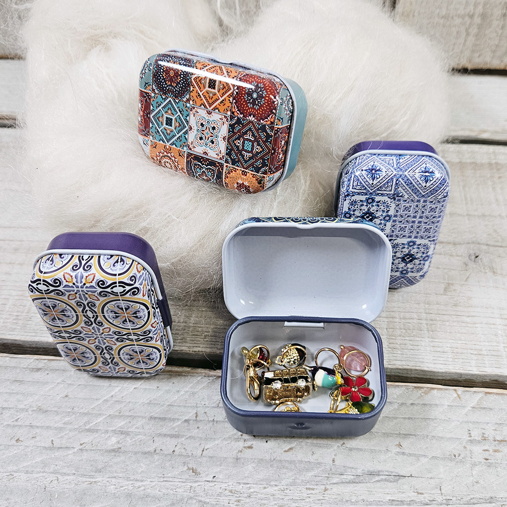 Sæt dós með áföstu loki, sem fullkomið er að geyma prjónamerki og framvindumerki í. Dósin er úr málmi og fallega myndskreytt.