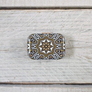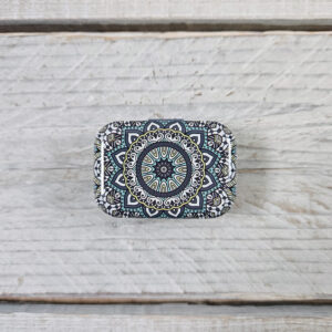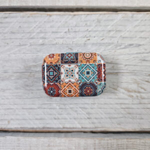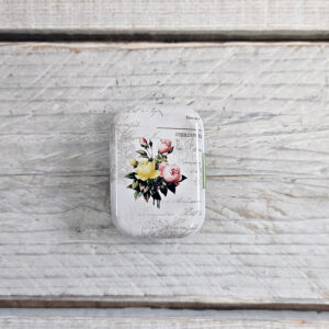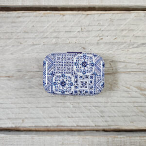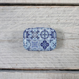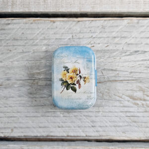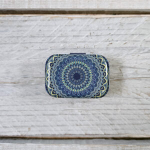 Sæt dós með áföstu loki, sem fullkomið er að geyma prjónamerki og framvindumerki í. Dósin er úr málmi og fallega myndskreytt.