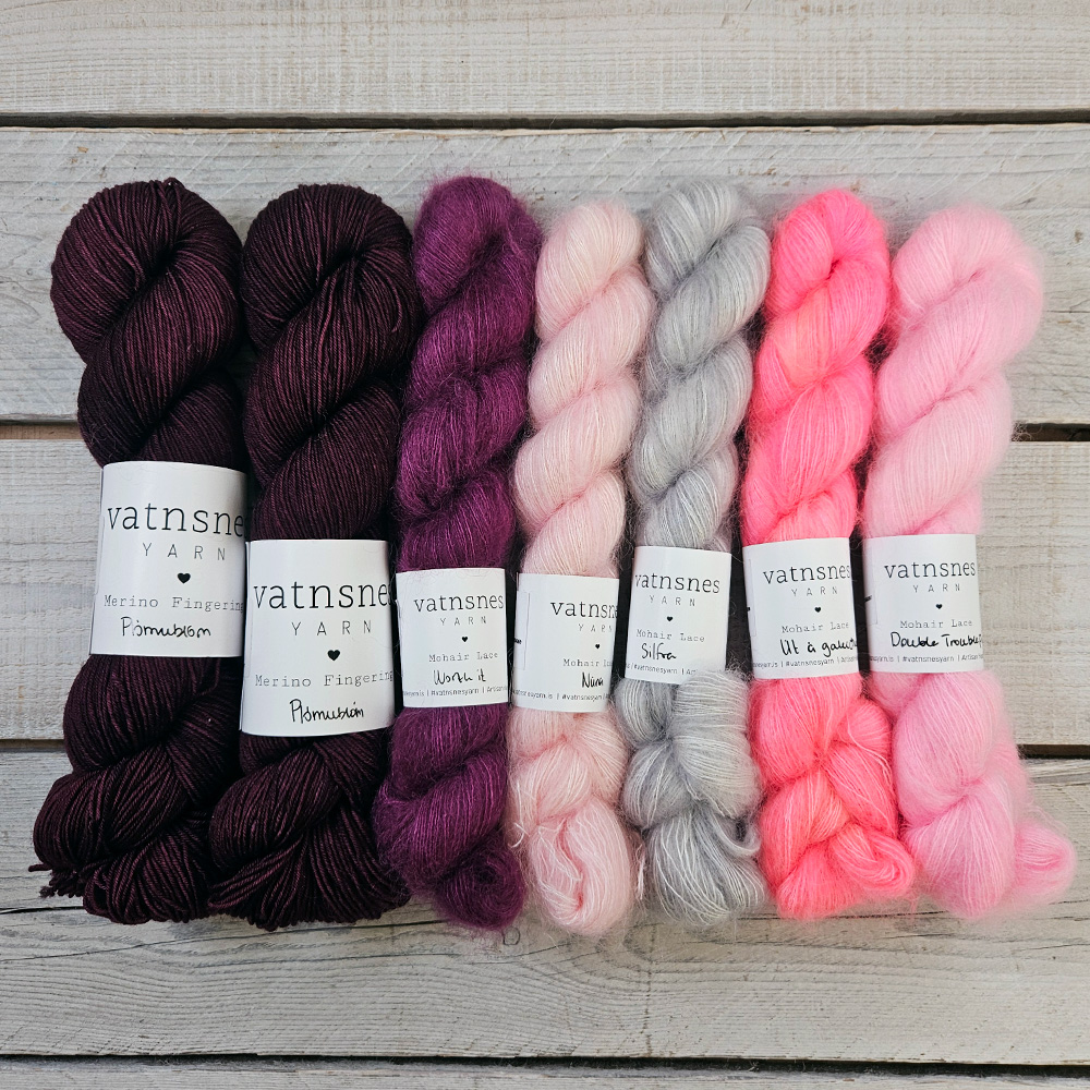 Í þessum pakka má finna 2 x 100g hespur af Merino Fingering og 5 x 50g hespur Mohair Lace.
