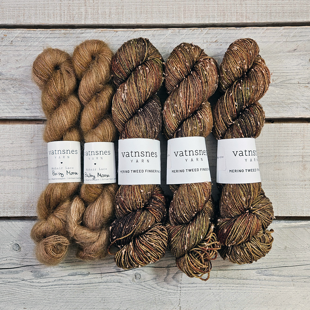 Í þessum pakka má finna uppskrift að Kusk og þrjár hespur af Merino Tweed Fingering og tvær Mohair Lace. Þennan pakka er hægt að nota í allar stærðir til og með XL. Sjá stærðir hér neðar.