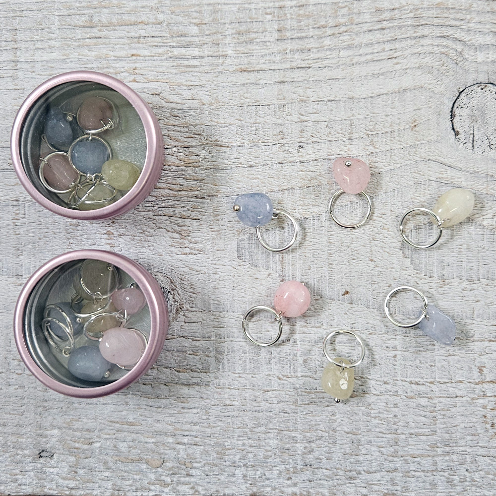 5 prjónamerki úr náttúrusteini. Merkin eru fyrir prjóna 4.0mm eða minni. Merkin koma í hentugri áldós með glæru loki.