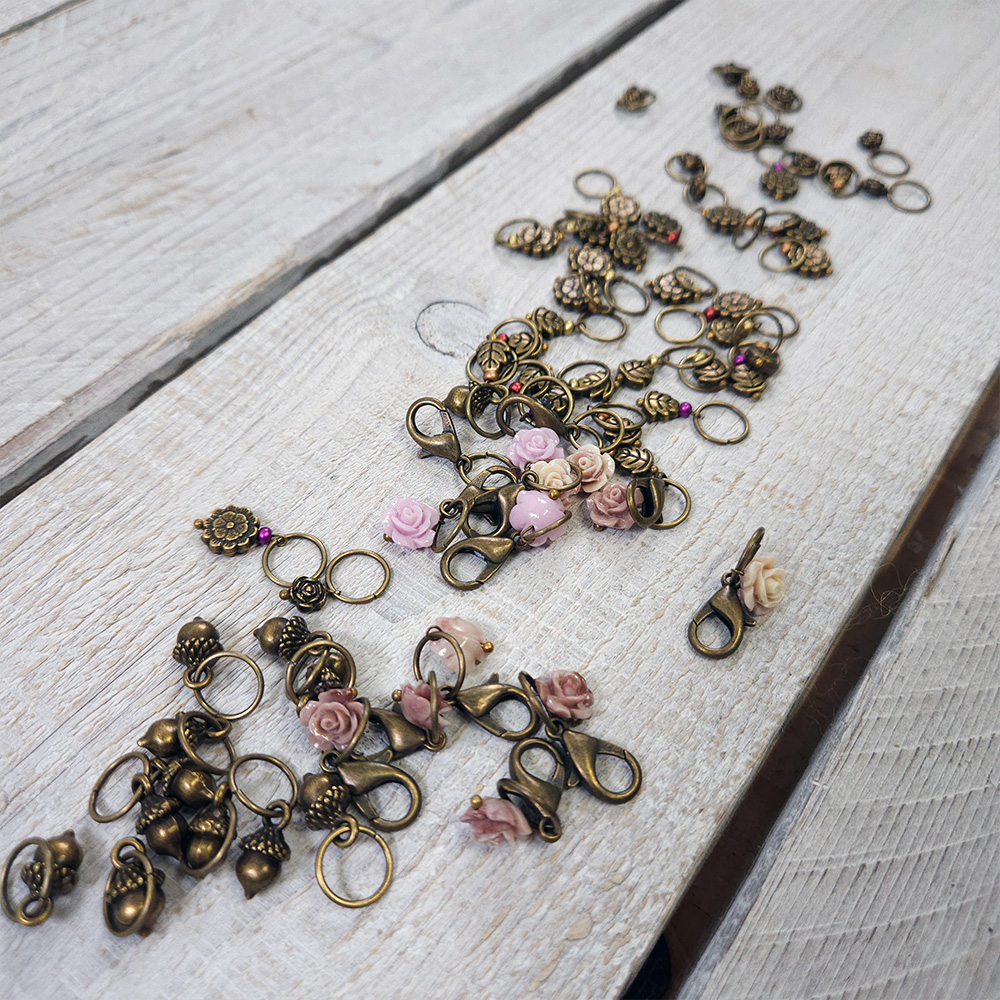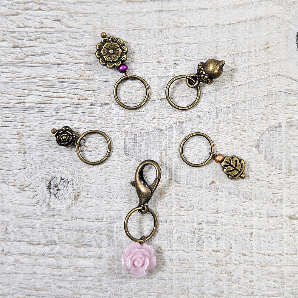 Hér er þemað „hallargarður á 18. öld“ – en hér eru sett saman koparlituð prjónamerki með antíkbleikri rós. Athugið að rósirnar eru ekki eins á litinn í öllum prjónamerkjum. Segðu til ef þú kýst einn lit fram yfir annan.