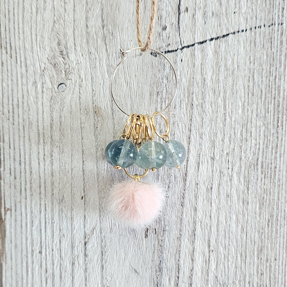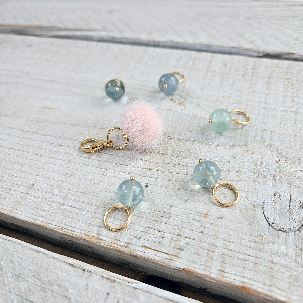 5 prjónamerki úr náttúrusteini og eitt framvindumerki sem er algjör dúlludúskur. Merkin eru fyrir prjóna minni en 4.0mm. Merkin koma í litlum poka úr organza efni.