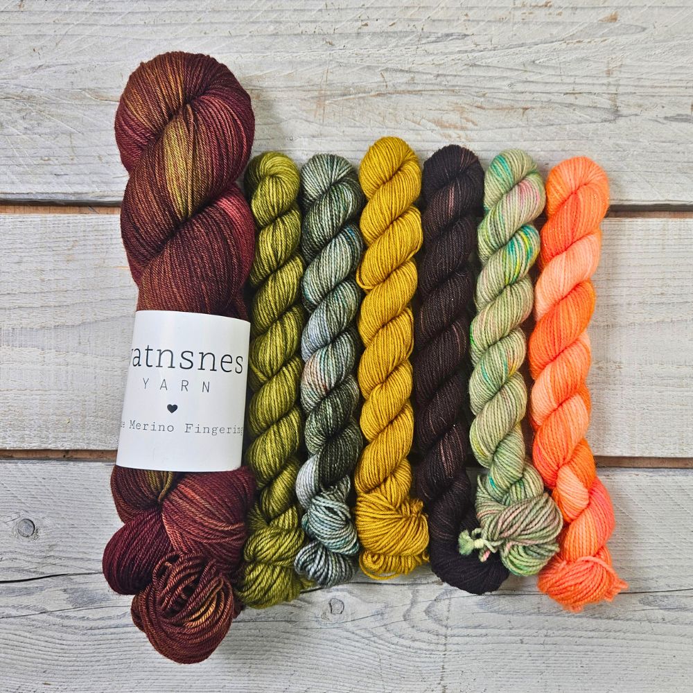 Aukalitir: 5, 5 (6, 6, 6) 6, 6 litir í 20 g hespum eða 150g mismunandi litir í fingering garni.
