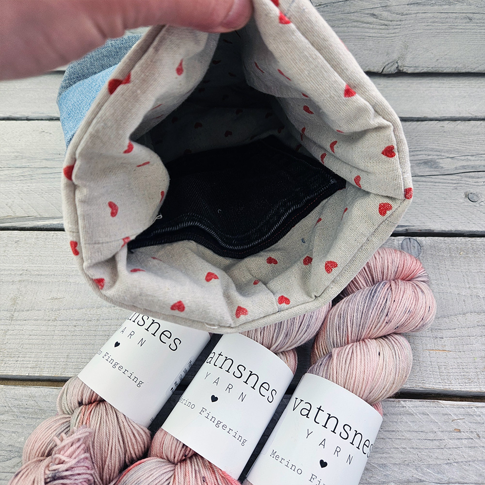 Svalur verkefnapoki handsaumaður af yours truly (mér, hér hjá Vatnsnes Yarn 🙂 ). Enginn annar nákvæmlega eins í öllum heiminum.
